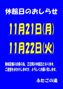 カテゴリー 定休日 アジェンダ アジェンダ 日 月 週 11月 – 12月 2022 11月 – 12月 2022 すべて閉じる すべて開く 11月 21 月 ふたごの湯 休館日 チケット 11月 21 – 11月 22 終日 笑楽亭(お弁当・お惣菜) チケット 11月 21 – 11月 25 終日 11月 23 水 たこ焼きまえちゃん チケット 11月 23 終日 11月 25 金 銀結び(鮭をメインにした商品等) チケット 11月 25 終日 11月 26 土 【出店】イオンモール石巻 チケット 11月 26 – 11月 27 終日 11月 28 月 笑楽亭(お弁当・お惣菜) チケット 11月 28 – 11月 30 終日 11月 30 水 たこ焼きまえちゃん チケット 11月 30 終日 12月 1 木 ふたごの湯12月予定表 チケット 12月 1 – 12月 31 終日 12月 2 金 遠峰あこ 唄うアコーデイオン弾きライブ 11:00~ チケット 12月 2 – 12月 4 終日 変更となり、12月2日(金)から12月4日(日)までの3日間ライブを行う事となりました。 是非お立ち寄りくださいませ🤗 12月 9 金 飯野川小学校 かしわっ子米販売 チケット 12月 9 @ 10:30 AM 11月 – 12月 2022 11月 – 12月 2022
